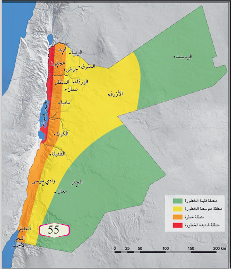 وتشير المعلومات التاريخية والجيولوجية المتوفرة عن المنطقة إلى أن القوة الزلزالية القصوى المتوقعة في الأردن قد تصل إلى (7.4-7.2) درجة على مقياس ريختر، وبناء على ذلك نفذت دراسات عديدة تتعلق بتقييم الخطر الزلزالي وآثاره في مناطق ومدن أردنية عديدة، وأنتجت الجمعية العلمية الملكية خريطة الخطورة الزلزالية في الأردن عام (2022) بالتعاون مع مجلس البناء الوطني التابع لوزارة الأشغال العامة والإسكان؛ للتقليل من الأخطار الناجمة عن الزلازل، أنظر الشكل (8).