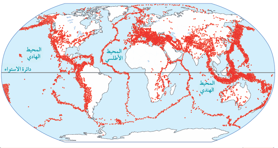 الشكل (6): تتوزع الزلازل في العالم عند حواف الصفائح الأرضية.