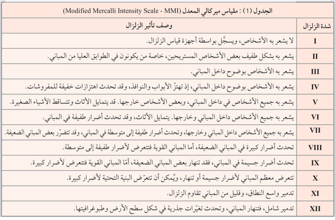 ويستخدم مقياس مير كالي لتقييم شدة الزلزال التي تشير إلى الأضرار الواقعية الناجمة عن الزلزال على سطح الأرض وعلى البشر والمباني والمنشآت والبيئة والكائنات الحية فيها؛ أي يصف هذا المقياس مقدار الدمار الذي يسببه الزلزال. يتكون مقياس ميركالي من 12 درجة، تعبر كل درجة عن مستوى مختلف من الشدة ومدى شعور الأشخاص به، أنظر الجدول (١).
