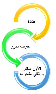 - الْحَرْفُ الْمُشَدَّدُ هُوَ حَرْفَانِ مُتَكَرِّرَانِ، الْأَوَّلُ سَاكِنٌ وَالثَّانِي مُتَحَرِّكٌ (يتم دمجهما معا في حرف واحد، ويوضع فوقهما الشدة وحركة الحرف الثاني سواء أكانت فتحة أم ضمة أم كسرة)