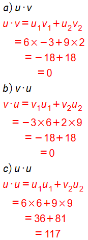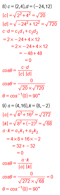 أجد ناتج الضرب القياسي للمتجهين في كل مما يأتي، ثم أجد قياس الزاوية المحصورة بينهما: