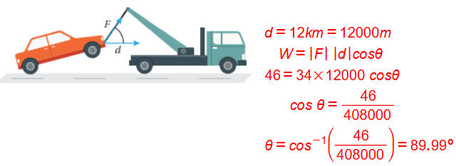 12) شيرات: تسحب شاحنة سيارة كما في الشكل المجاور. اذا كان مقدار قوة السحب F=34N، والمسافة المقطوعة d=12km، وشغل الشاحنة المبذول W=46J، فاجد قياس زاوية السحب