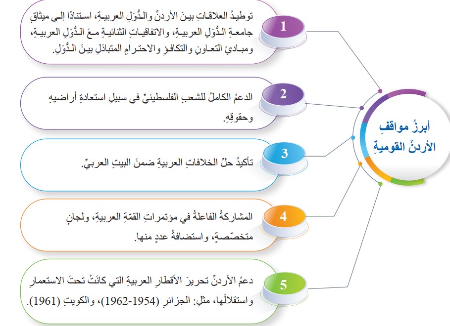 دافعَ الأردنُّ عن القضيةِ الفلسطينيةِ في المحافلِ الدوليةِ، وأبرزَ معاناةَ الشعبِ الفلسطينيِّ تحتَ نيرِ الاحتلالِ، وأكّدَ حقَّهُ في إقامةِ دولتِهِ المستقلةِ على أراضيهِ وعاصمتُها القدسُ.