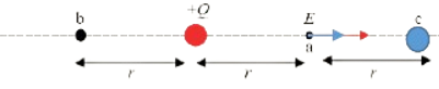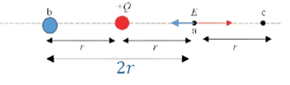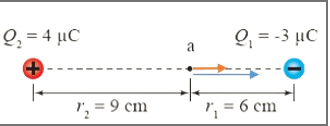 بافتراض شحنة اختبار موجبة عند النقطة (a) نحدد اتجاه فنجد أن النقطة تتأثر بمجاليين متعاكسين بالاتجاهات المبينة في الشكل الآتي: