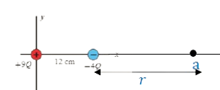 5- .ينعدم المجال الكهربائي عند نقطة، عندما تتأثر النقطة بمجالين متساويين مقدارا ومتعاكسين اتجاها.ويتحقق لك عند نقطة تقع خارج الشحنتين على امتداد الخط الواصل بينهما، ومن جهة الشحنة الأصغر مقدارا نفترض أن هذه النقطة (a) وتبعد مسافة (r) عن الشحنة (-4Q):