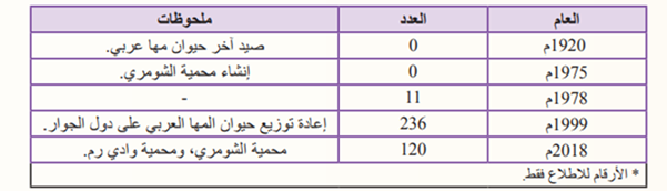 6- يمثل الجدول الآتي أعداد حيوان المها العربي في الأردن من عام 1920م إلى عام 2018م . أدرس الجدول ثم أجيب عن السؤالين التاليين :