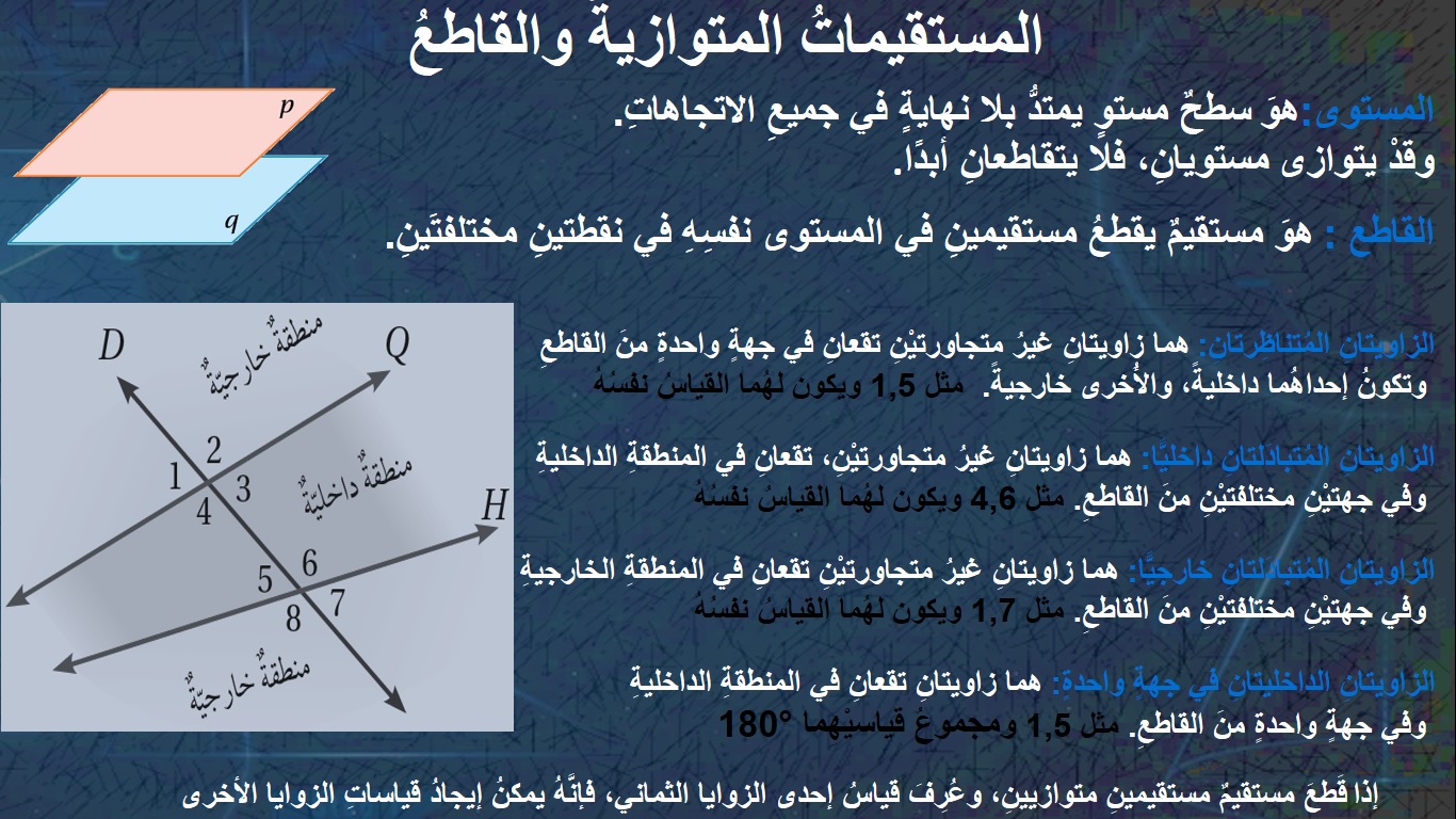 المستوى: هوَ سطحٌ مستوٍ يمتدُّ بلا نهايةٍ في جميعِ الاتجاهاتِ. وقدْ يتوازى مستويانِ، فلا يتقاطعانِ أبدًا. القاطع : هوَ مستقيمٌ يقطعُ مستقيمينِ في المستوى نفسِهِ في نقطتينِ مختلفتَينِ.