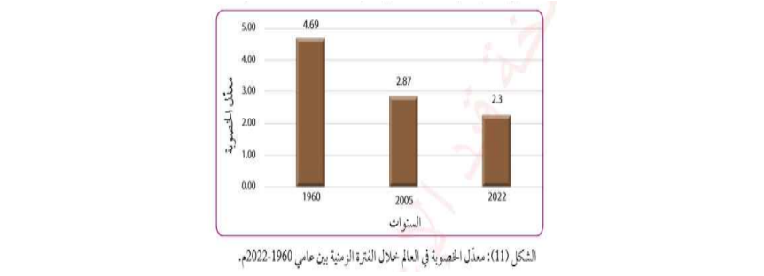 يوضح الشكل الاتي معدل الخصوبة في العالم خلال الفترة الزمنية بين عامي(١٩٦٠-٢٠٢٢م):