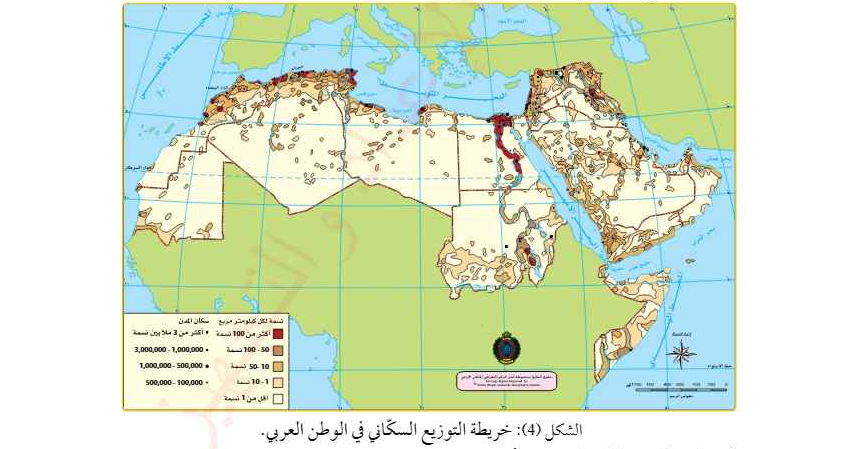 - للتعرف على توزيع السكان في الوطن العربي ، أتأمل خريطة الكثافة السكاني الآتية :