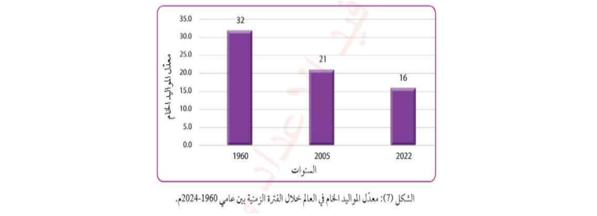 - يوضح الشكل الآتي معدل المواليد الخام في العام خلال الفترة الزمنية بين عامي١٩٦٠-٢٠٢٤م :