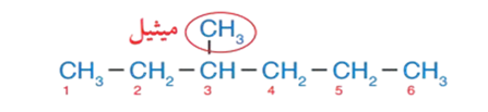 5- أكتب اسم المُركّب كاملًا فيصبح: 3- ميثيل هكسان. ألاحظ أنّ طريقة كتابة اسم المُركّب يمكن أن تكون على الصيغة العامة: رقم التفرّع - اسم التفرّع اسم الألكان.
