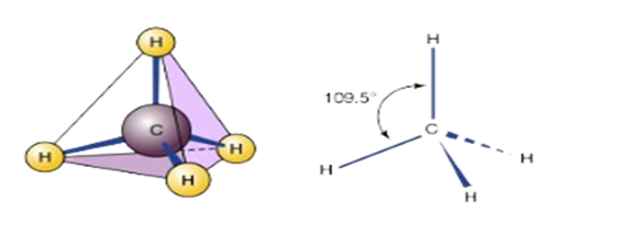 يعتبر الميثان أبسط الألكانات، وشكله رباعي الأوجه منتظم، وتهجين الكربون فيه من نوع ، والزاوية التي تحصر روابطه .