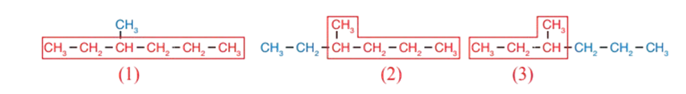 يتّضحُ ممّا سبق أن هناك ثلاث سلاسل، أختار منها السلسلة (1) التي تحتوي على ستّ ذرّات كربون، وتُسمّى هكسان، فهي أطول سلسلة لأنّها تحتوي على أكبر عدد من ذرّات الكربون.
