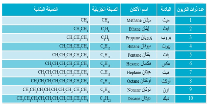 الألكانات العشرة الأولى، وصيغها الجزيئية والبنائية المختصرة.
