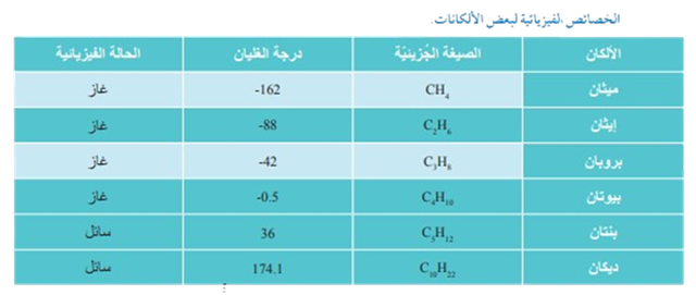 يبين الجدول الخصائص الفيزيائية لبعض الألكانات، حيث تكون الألكانات الأربعة الأولى غازيةً؛ في حين تصبح سائلة من البنتان إلى الألكان الذي يحتوي على 16 ذرّة كربون، وتصبح صلبة في الألكانات التي تحتوي على أكثر من 16 ذرّة كربون، ويلاحَظ