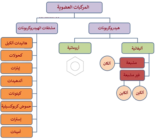 تقسم المركبات العضوية حسب نوع العناصر الداخلة في تركيبها إلى صنفين رئيسين هما الهيدروكربونات ومشتقات الهيدروكربونات، المخطط التالي يبين هذين الصنفين والمركبات العضوية التي تنضوي تحتهما: