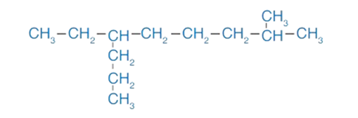 2 - أُعطي أرقامًا وأسماء للتفرّعات، حيث يقع التفرّع الأول على ذرّة الكربون رقم 2؛ ويقع التفرّع الثاني على ذرّة الكربون رقم 6، وبما أن التفرّعين غير متشابهين (ميثيل وإيثيل)، واعتمادًا على اللغة الإنجليزية؛ فإنّ إيثيل تسبق ميثيل؛ لذا فإنّ 6- إيثيل تُكتَب في الاسم قبل 2- ميثيل ، فيصبح على النحو الآتي: 6- إيثيل -2- ميثيل .
