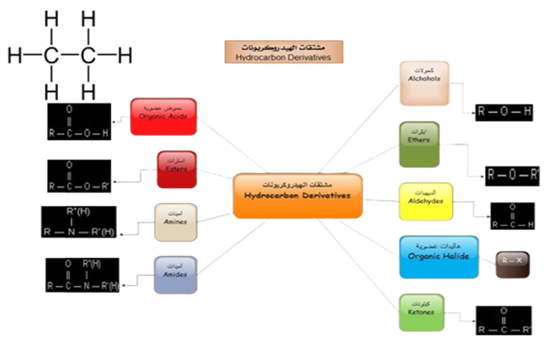 تشمل مشتقات الهيدروكربونات العديد من المركبات العضوية، أهمها: