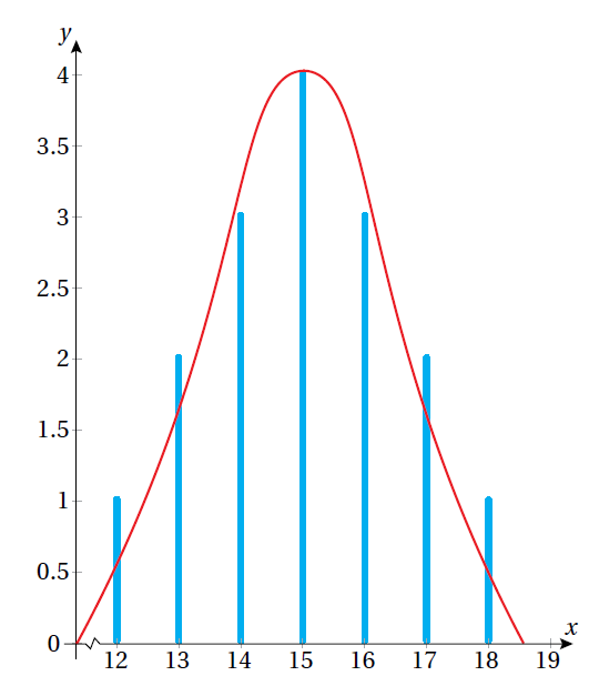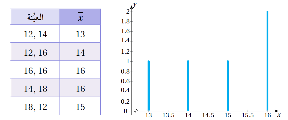 يُبيِّن الجدول الآتي الأوساط الحسابية لخمس عيِّنات عشوائية، حجم كلٍّ منها 2، وقد أُخِذت مع الإرجاع من مجتمع، وسطه الحسابي 15 ، وانحرافه المعياري 2.24 ، وهو يتكوَّن (أيِ المجتمع) من القِيَم الآتية: 18 , 16 , 14 , 12 ، في حين يُبيِّن التمثيل البياني المُعطى شكل التوزيع لهذه الأوساط الحسابية.