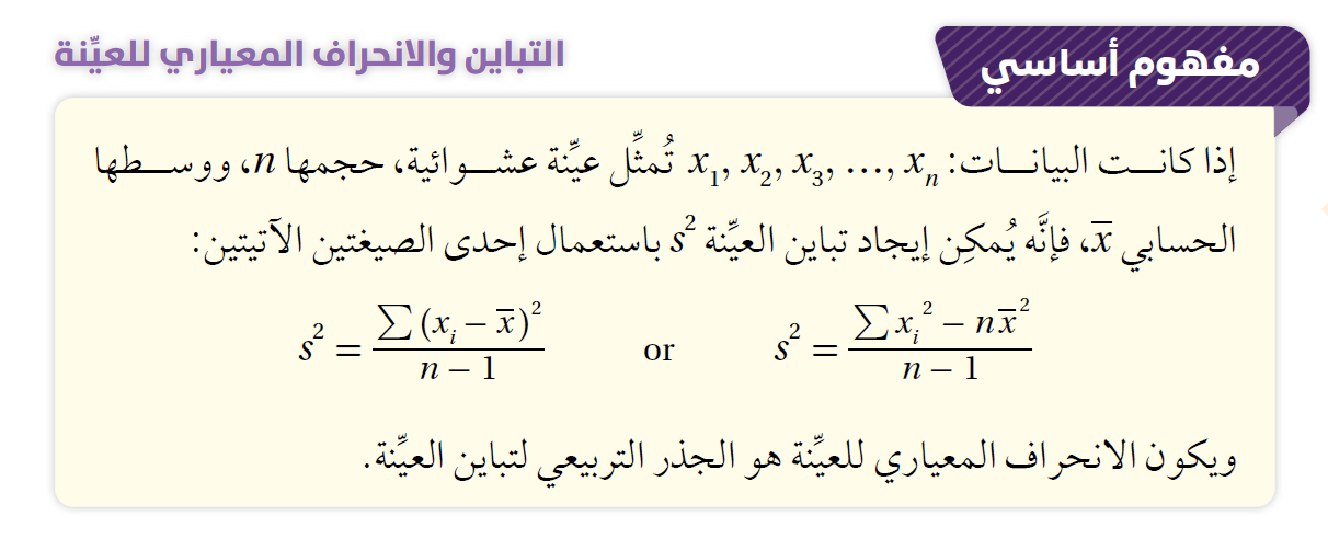أمّا تباين العيِّنة، الذي يُستعمَل لتقدير تباين المجتمع، فيُرمَز إليه بالرمز s2 ، ويُمكِن إيجاده باستعمال إحدى الصيغتين اللتين يُبيِّنهما صندوق (مفهوم أساسي) الآتي.