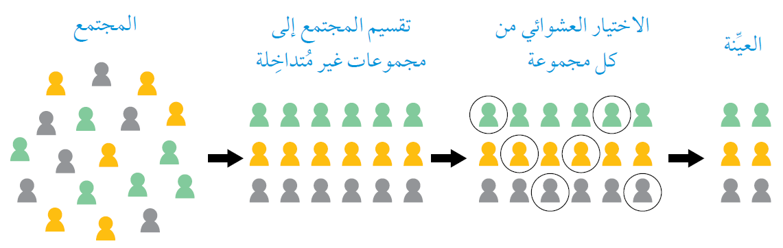 أتعلم: لا يُشترَط في العيِّنة العشوائية الطبقية اختيارُ العدد نفسه من كل فئة؛ إذ يُمكِن اختيار عدد يتناسب مع حجم كل فئة، أو اختيار العدد نفسه من كل فئة.