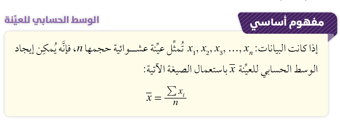 يُرمَز إلى الوسط الحسابي للعيِّنة، الذي يُستعمَل لتقدير الوسط الحسابي للمجتمع، بالرمز x، ويُقرَأ: x بار، ويُمكِن إيجاده باستعمال الصيغة التي يُبيِّنها صندوق (مفهوم أساسي) الآتي.