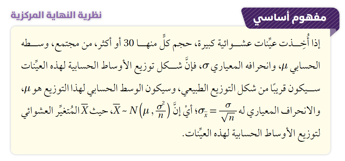 تعلَّمْتُ إيجاد الوسط الحسابي لعيِّنة مأخوذة من المجتمع، وقد لاحظْتُ أنَّ الوسط الحسابي يختلف تبعًا لاختلاف العيِّنة.
