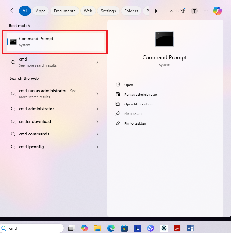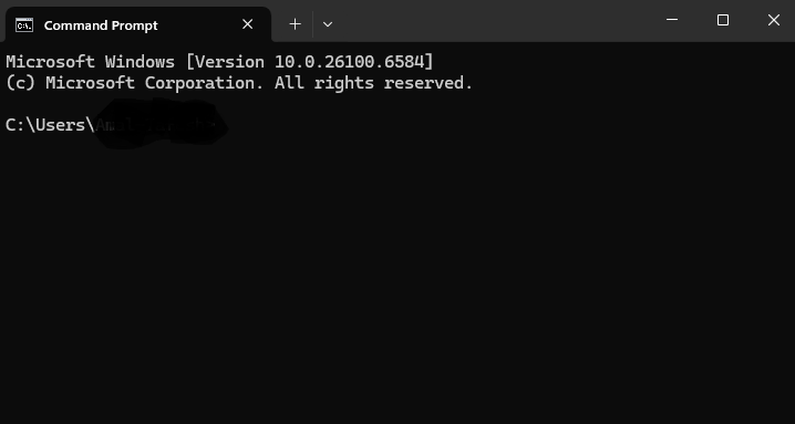 كما تعلمنا سابقًا،يمكننا تثبيت ما نحتاج من خلال شاشة الاوامر Command Prompt والتي يمكن الوصول لها من خلال نظام التشغيل المثبت على الجهاز بعد كتابة الامر cmd كما يظهر معنا في الشكل التالي: