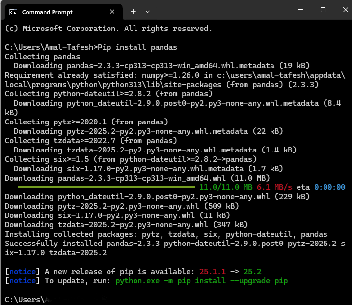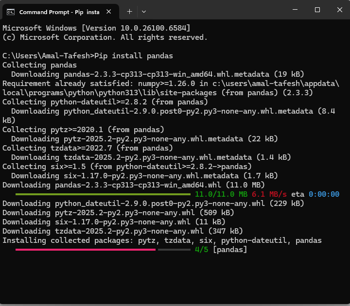 وبعد الضغط على مفتاح الدخول Enter، تبدأ عملية تحميل الملفات الخاصة بالمكتبة (Pandas) كما يظهر معنا في الشكل التالي: