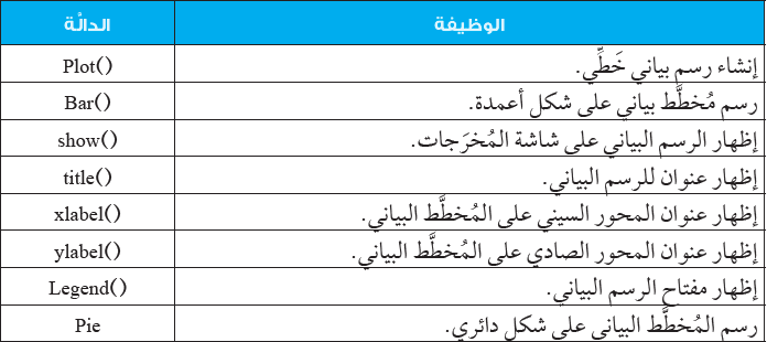 ويظهر الجدول التالي عددًا من الأمثلة على الدوال الشائعة في مكتبة (Matplotlib):