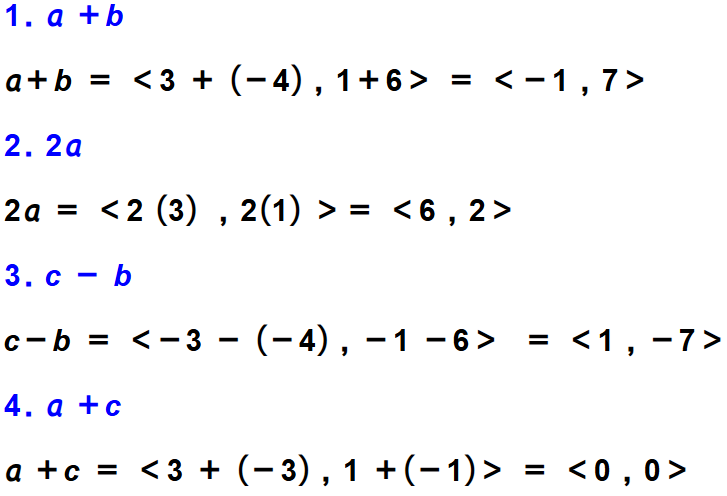 يمكن إيجاد ناتج الجمع والطرح والضرب في ثابت للمتجهات المكتوبة بالصورة الإحداثية عن طريق جمع مركباتها الأفقية و الرأسية ، أو طرحها .
