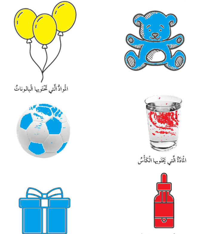 أُلَوِّنُ الْمَوادَّ الصُّلْبَةَ بِاللَّوْنِ الْأزْرَقِ، وَالْمَوادَّ السّائِلَةَ بِاللَّوْنِ الْأحْمَرِ، وَالْمَوادَّ الْغازِيَّةَ بِاللَّوْنِ الْأصْفَرِ في ما يَأْتي:
