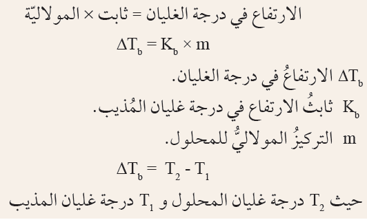2- الارتفاعَ في درجةِ الغليان Boiling Point Elevation (ΔTb) ، وهو يتناسبُ طرديًّا معَ النسبة بين عدد جُسيمات المُذاب وَجُسيمات المُذيب في المحلول؛ ولذلك يُستخدمُ التركيزُ المولاليُّ للمحلول للتعبير عنِ الارتفاع في درجة الغليان؛ لأنه يعتمدُ على النسبة بين عدد جُسيمات المُذاب وعدد جُسيمات المُذيب وليس على نسبة عدد جُسيمات المُذاب في حجم معيّن منَ المحلول، أمّا مقدارُ الارتفاع في درجة غليان المحلول فيتناسبُ طرديًّا معَ التركيز المولاليِّ للمحلول.