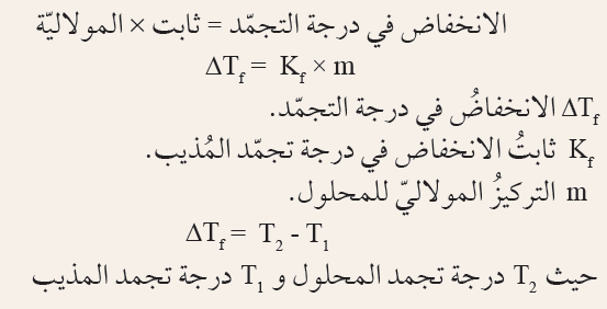 •الانخفاضُ في درجة التجمّد Freezing Point Depression : الفرقُ بين درجة تجمّد المحلول ودرجة تجمّد المُذيب النقيّ عند إذابة 1mol مِنَ المُذاب في 1Kg منَ المُذيب النقيّ.