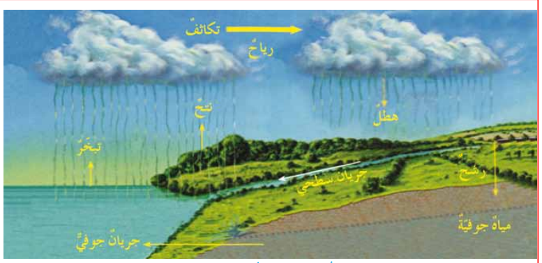 سوف تجد ان دورة الماء في الطبيعة(hydrologic cycle) تبدأ بالتبخر من المسطحات المائية والسطوح الرطبة واليابسة بفعل حرارة الشمس ،حيث يرتفع بخار الماء بفعل تيارات الهواء الصاعدة الى طبقات الجو العليا فيبرد ويتكاثف ثم يعود الى سطح الارض من خلال عملية الهطول ثم يبدأ بالجريان السطحي(surface runoff) ( حركة مياه الامطار على سطح الارض مشكلة الوديان والانهار والسيول ...) وقد تتخلل هذه المياه مسامات التربة والصخور لتتجمع في طبقة صخرية لها خصائص مميزة( سوف تطلع عليها في الدرس القادم ) مكونة المياه الجوفية(groundwatr) وهذه العملية يطلق عليها الرشح (infiltration ) ، وعملية انتقال المياه الجوفية من مكان لآخر تعرف بالجريان الجوفي (subserface runoff) ، الذي يصل في النهاية الى البحار والمحيطات وقد يعود جزء من هذه المياه للتبخر مرة أخرى وتستمر هذه العملية
