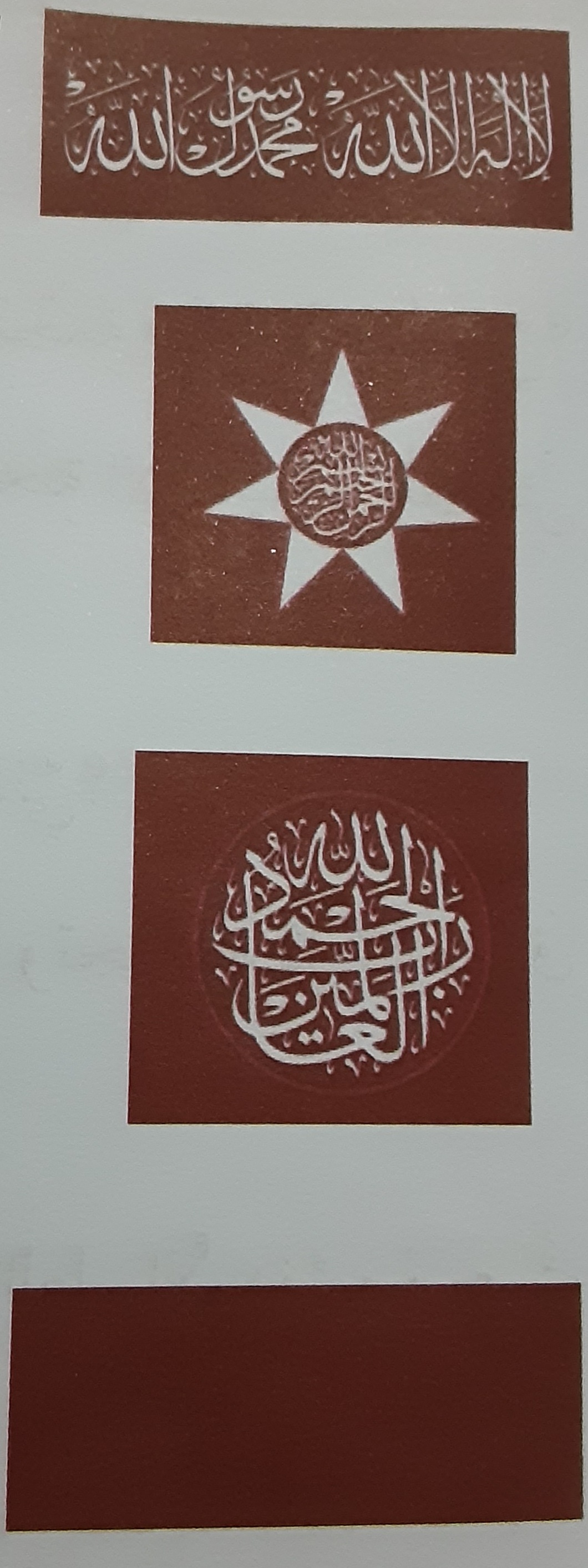٣- يوضع عليه من ناحية السارية مثلث قائم احمر قاعدتة متساوية لعرض الراية وارتفاعه مساو لنصف طولها وفي هذا المثلث كوكب ابيض سباعي الأشعة