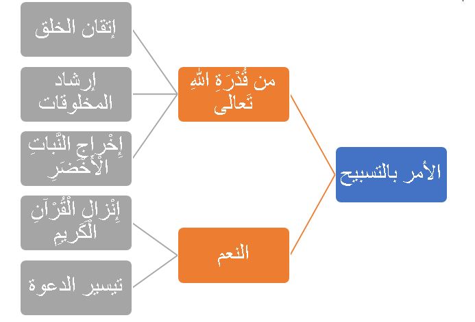 - يَأْمُرُ اللهُ تَعالى الْمُؤْمِنَ بِالتَّسْبيحِ وَإِبْعادِهِ عَنْ أَيِّ نَقْصٍ أَوْ عَيْبٍ، فَاللهُ تَعالى هُوَ الْأَعْلى بِصِفاتِهِ، وَلا يُشْبِهُ شَيْئًا مِنَ الْمَخْلوقاتِ؛ فَهُوَ سُبْحانَهُ واحِدٌ أَحَدٌ حَيٌّ لا يَموتُ، وَلا يَمْرَضُ، وَلا يَتْعَبُ، وَلا يَنامُ، وَلَيْسَ لَهُ وَلَدٌ، لِذا يُسْتَحَبُّ لِلْمُسْلِمِ أَنْ يُرَدِّدَ دائِمًا: «سُبْحانَ اللهِ وَبِحَمْدِهِ، سُبْحانَ اللهِ الْعَظيمِ