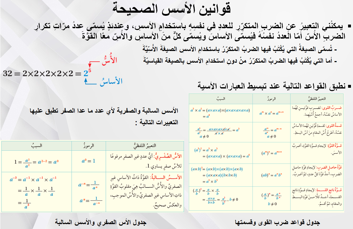 - تُسمّى الصيغةُ التي يُكْتَبُ فيها الضربُ المتكرِّرُ باستخدامِ الأسسِ الصيغَةَ الأُسِّيَّةَ