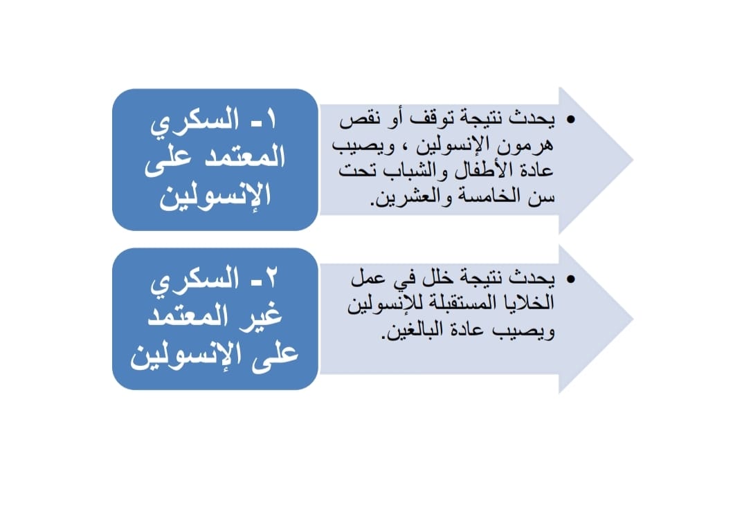 1- السكري المعتمد على الأنسولين 2- السكري غير المعتمد على الأنسولين