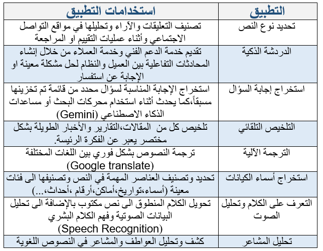 ويمثل الجدول التالي عدد من التطبيقات العملية لمعالجة اللغات الطبيعية: