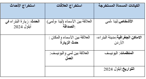 مثال: لديك النص التالي "زارت لينا مدينة البتراء الوردية في الأردن برفقة صديقتها لمى التي تعمل مع اليونيسف في أيلول 2024"