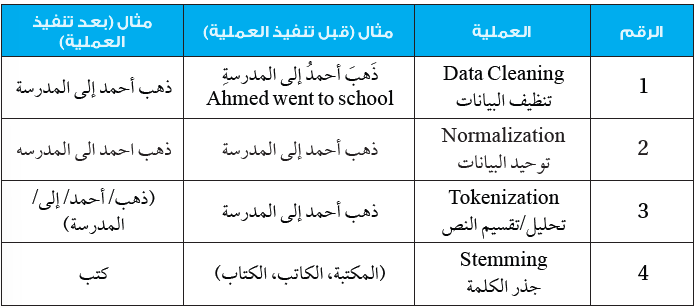 وفيما يلي جدولاً يمثل أمثلة على المعالجة القبلبة للبيانات في اللغة العربية: