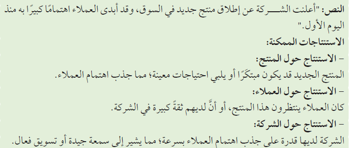 ب.الاستنتاج النصي:ويقصد به القدرة على استنتاج معلومات جديدة إو غير مباشرة من النص وذلك لغايات فهم العلاقات الضمنية بين الأفكار واستخلاص المعلومات التي لم يتم ذكرها بالشكل الصريح.