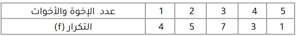 يُبيِّنُ الجدولُ التالي عددَ الأخوةِ والأخواتِ لمجموعةٍ منْ طلاب الصفِّ التاسعِ في إحدى المدارس. أجدُ التباينَ والانحرافَ المعياريَّ لهذهِ البياناتِ.