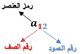 مثال : يرمز إلى العنصر الواقع في الصف الأول والعمود الثاني في المصفوفة A بالرمز  a12  ، والتوضيح حسب المخطط