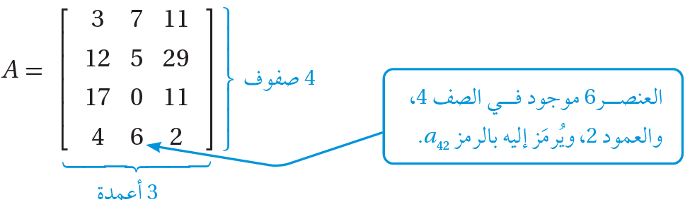 * يستدل على العنصر في المصفوفة بموقعه الذي يحدده كل من الصف والعمود الذي يقع فيه هذا العنصر.