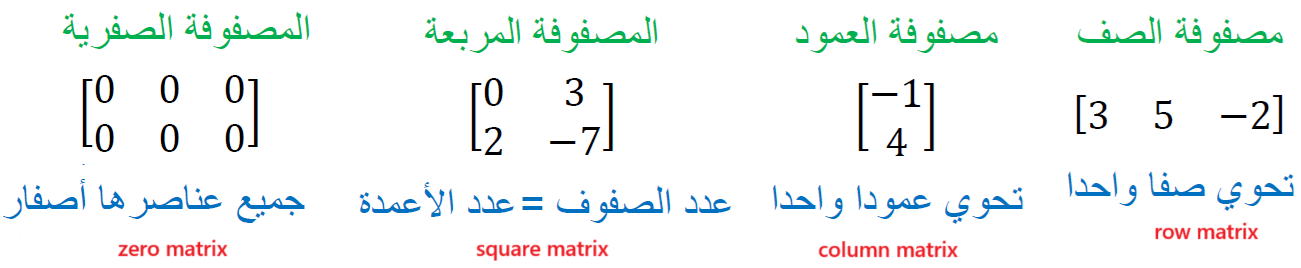 المصفوفة (matrix): هي ترتيب على هيئة مستطيل لأعداد أو متغيرات في صفوف أفقية و أعمدة رأسية محصورة بين قوسين من هذا النوع