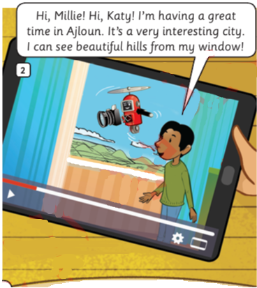 مرحباً، ميلي! مرحباً، كاتي! أنا أستمتع بوقتي في عجلون. إنها مدينة ممتعة جداً. أستطيع رؤية التلال الجميلة من نافذتي!