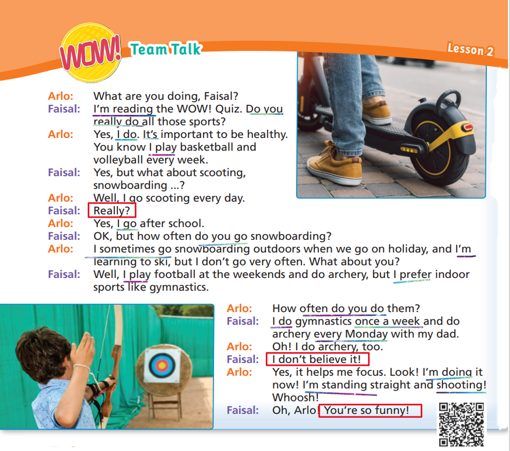 Arlo and Faisal are talking about sports. Arlo says he plays basketball and volleyball every week and goes scooting every day. He sometimes goes snowboarding on holiday and is learning to ski. Faisal plays football at the weekend and does archery with his dad. Both boys enjoy different sports, and they talk about what they like and how often they do them.