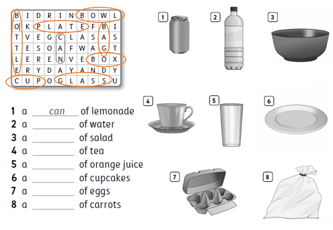 2 bottle, 3 bowl, 4 cup, 5 glass, 6 plate, 7 box, 8 bag